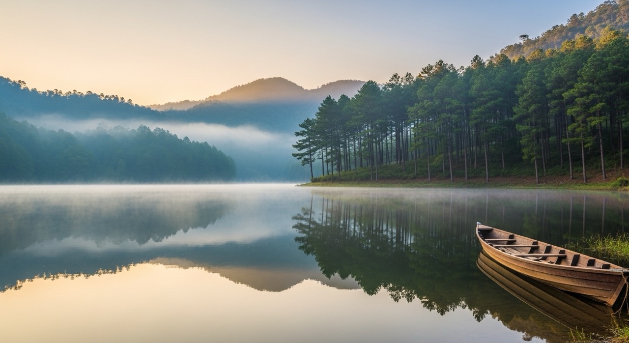 Serene mountain lake surrounded by pine forests